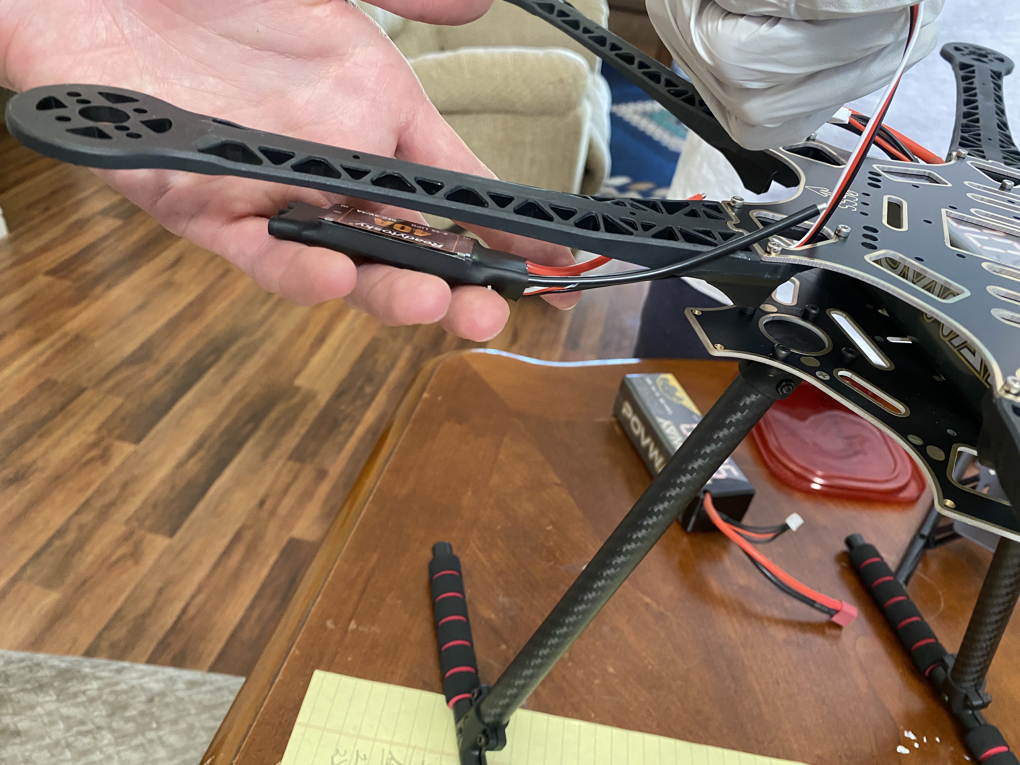 In this session, we put the drone parts together, and take measurements for clearances. Since the batteries are large, we are thinking about raising the top part of the structure up a little, supported by 3D printed friction supports. We also had to start thinking about where to feed wires through on the structure.